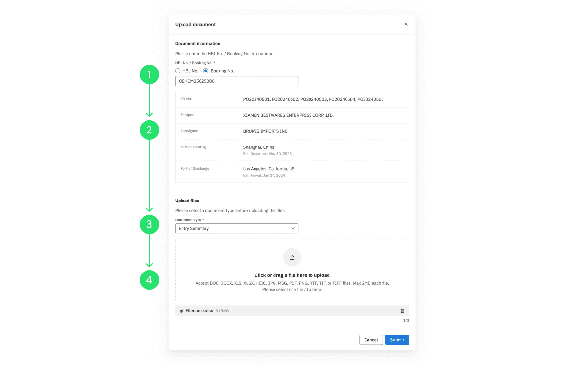 Since the process of uploading documents is relatively simple, a single dialog box is sufficient to contain all necessary information. After discussing with the PM, I moved the upload flow from a dedicated page to a dialog. This update allows users to remain on their current screen and maintain context, which is particularly valuable when they are using the Booking and Shipment features.