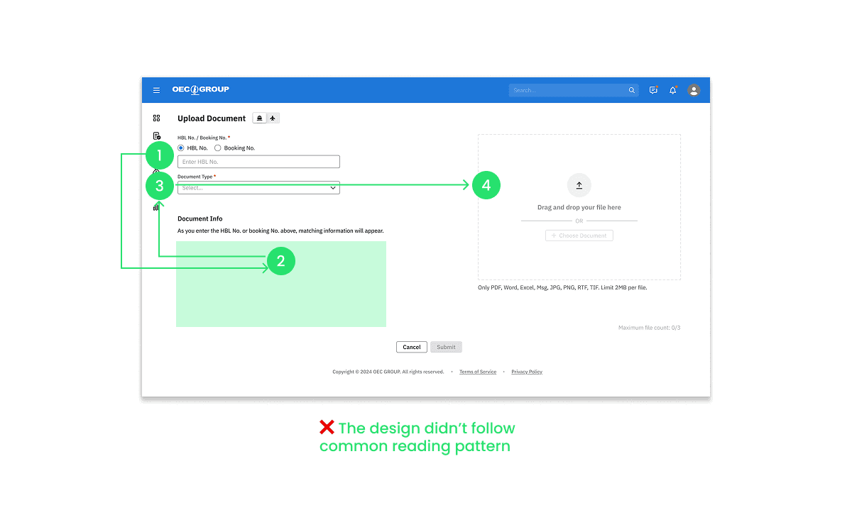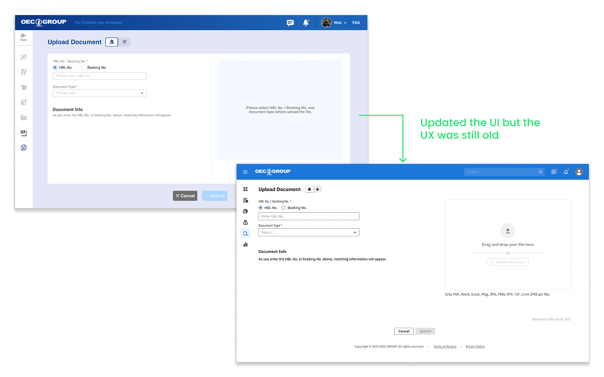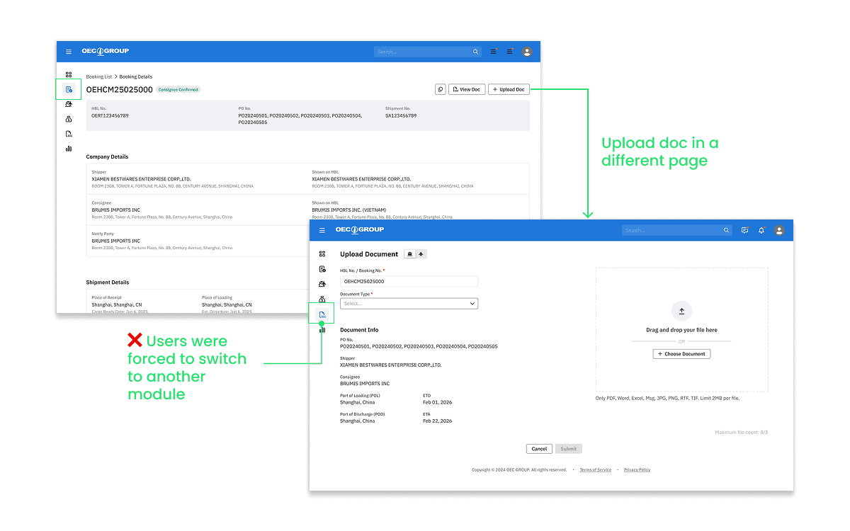 When users click on the ‘Upload’ button, they would be guided to a new page where they can search for the booking number and upload files to the corresponding booking. When the users were already in the Document feature, this wouldn’t cause much of an issue. However if they were originally in the Booking or Shipment feature, they’d still be redirected to a new page and it was difficult to return to where they were. This interrupted the flow and caused them to lose context.
