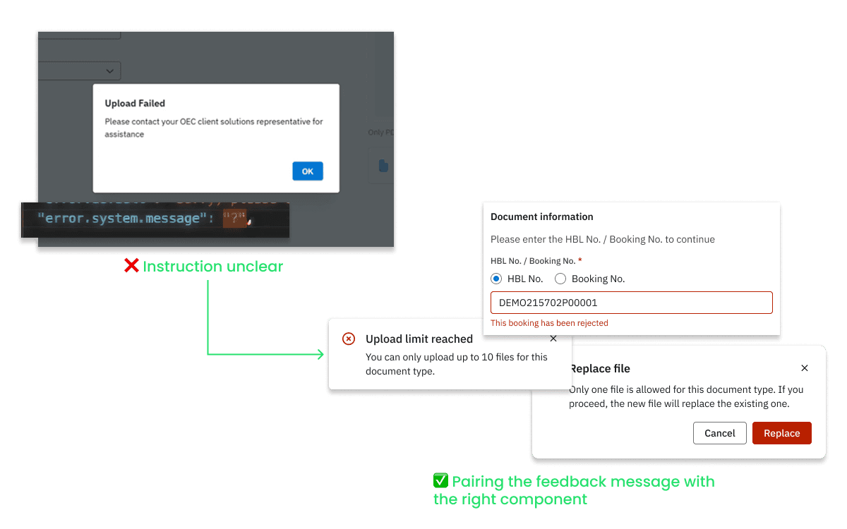 To improve the feedback experience, I first worked with the front-end to understand where each error message came from. Knowing whether it was triggered by the frontend, or returned from the backend allowed me to write the right messages and determined the detail I needed to provide. I then went on to choose the UI component that best carried the message.