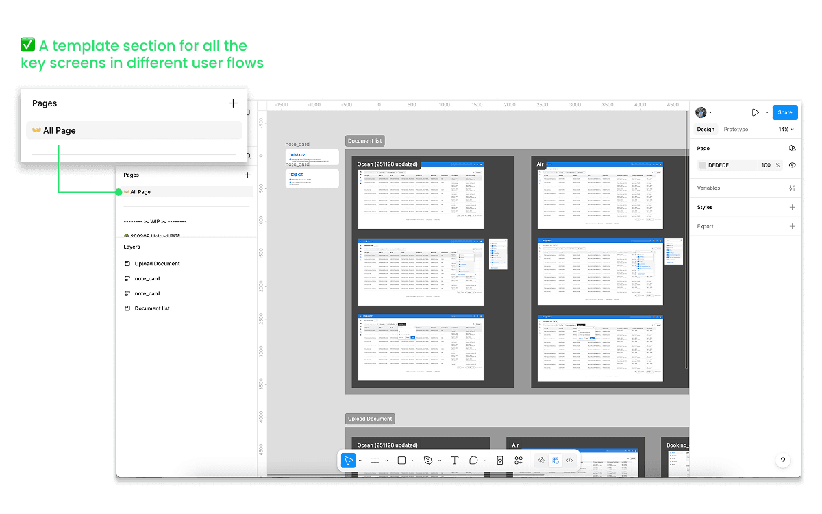 To solve this problem, I extracted the most fundamental screens for different user flows in the document feature and created a ‘template’ section. Future designers can now make changes based on these templates without carrying over any ‘dirty frames’. It also saves them from manually searching through the Figma file to find the screens they need.